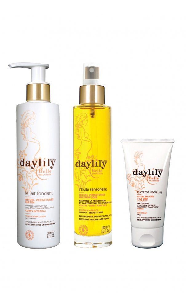 L’huile et la crème fondante Daylily Paris pour éviter les vergetures et après l’accouchement les coupelles en argent Silverette qui ont préservé ma poitrine durant tout l’allaitement.