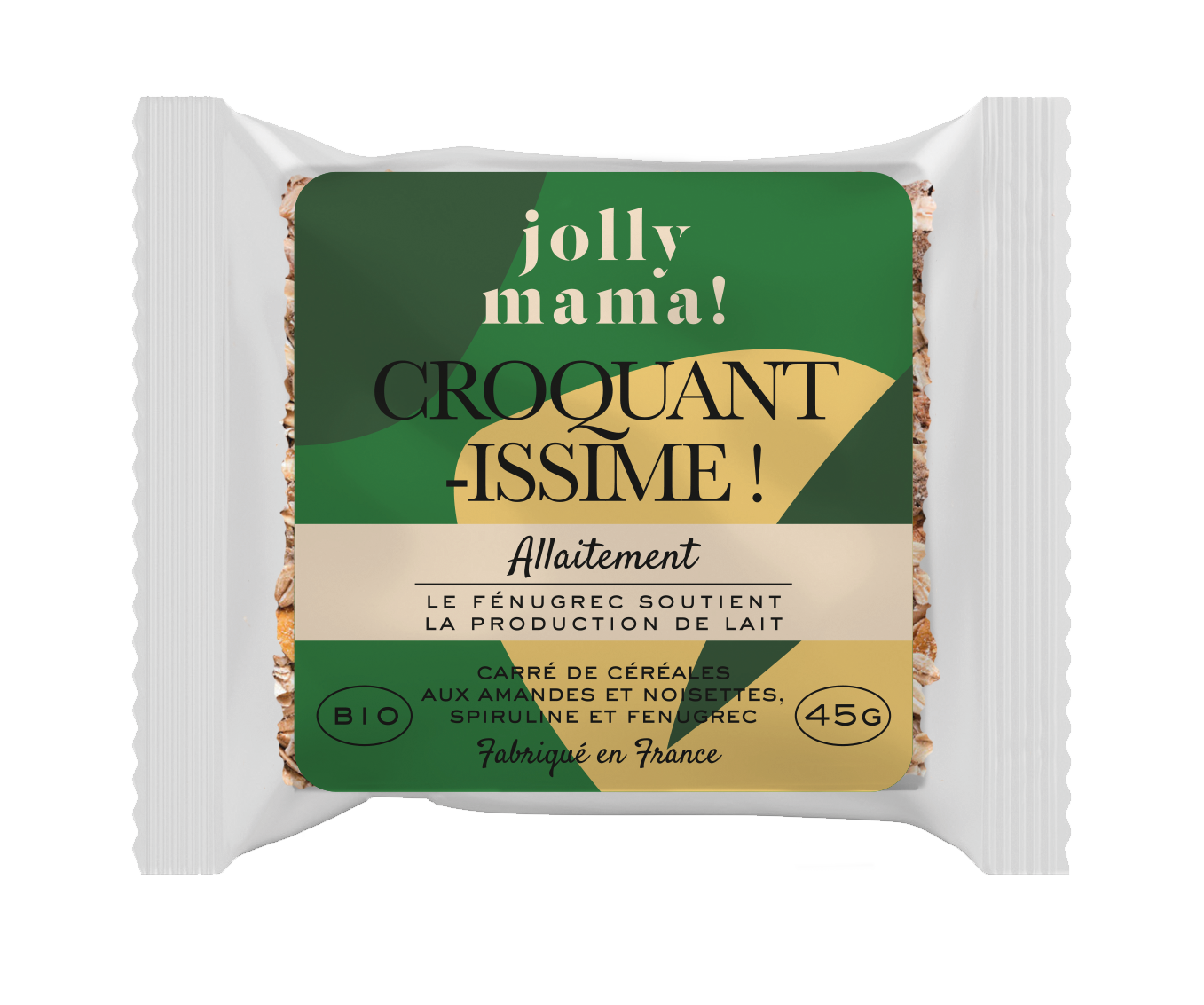 Flocons d’avoine, amandes, graines de lin, graines de tournesol, fenugrec (qui soutient la production de lait et aide à la récupération post-partum), sirop d’agave… Des ingrédients 100% naturels sélectionnés avec amour par Jolly Mama pour leurs apports nutritifs, leurs effets, leur faible indice glycérique et leur pouvoir anti-oxydant. Les carrés sont fabriqués dans une petite usine certifiée Bio dans le Sud Ouest de la France.